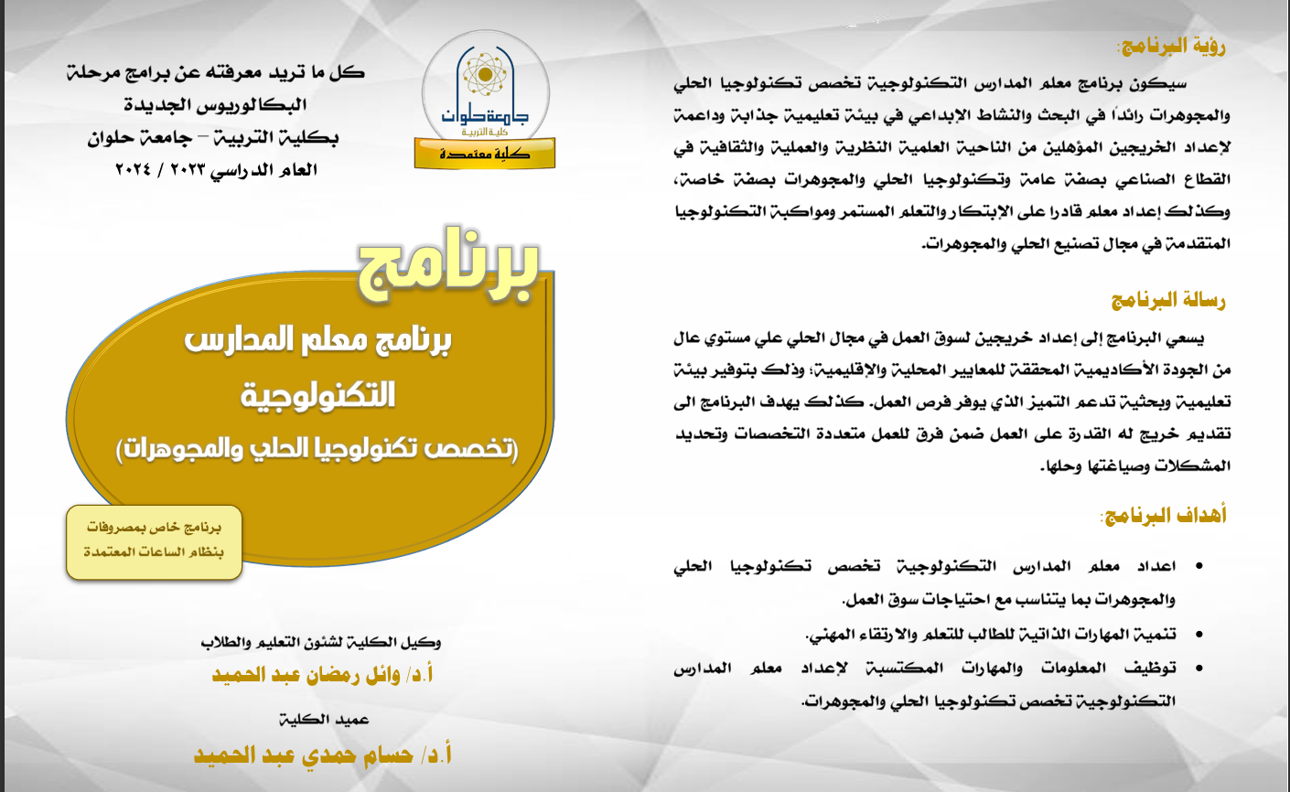 معرض قسم الفنون الصناعية علي هامش مؤتمر كلية التربية الأربعاء والخميس 21 -22 فبراير 2024 يتقدم السيد الأستاذ الدكتور/ حسام حمدي "عميد الكلية" ، وقسم الفنون الصناعية بقيادة أ.د/ هيام مهدي رئيس القسم بخالص التهنئة للأستاذ الدكتور/ طلعت محمود حسن "الأستاذ بقسم التعليم الفني والصناعي"، بمناسبة حصوله على الترتيب السابع ضمن أفضل 40 باحث متميز علي مستوى جامعة حلوان؛ طبقاً للتصنيف الدولي للبحوث المنشورة دولياً (14 ديسمبر 2023 ) . متمنياً لسيادته دوام التوفيق والتقدم.