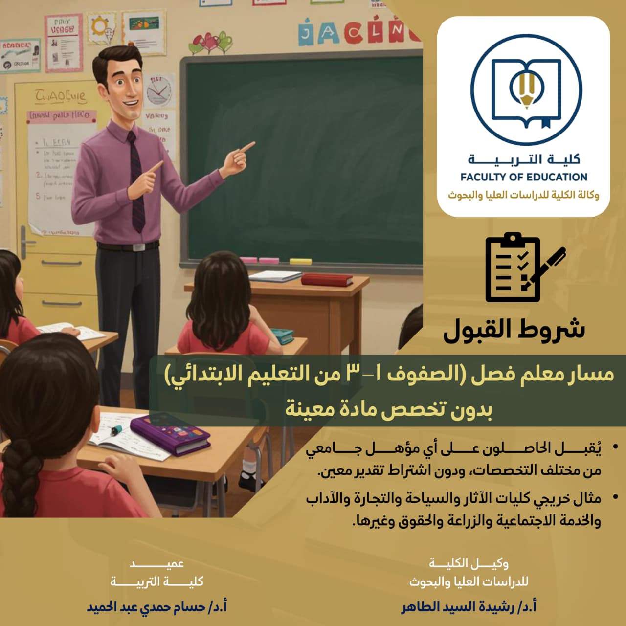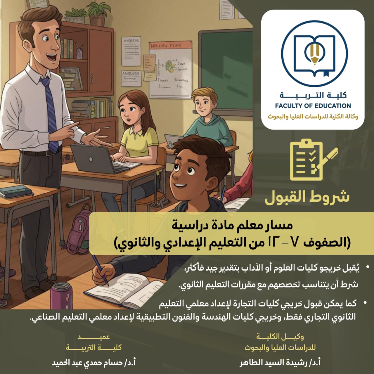 ويشترط أن يكون المتقدم حاصلاً على تقدير جيد على الأقل، وأن يكون خريجا من كليات العلوم أو الآداب أو ما يماثلها، مع ضرورة ملاءمة تخصصه للمناهج في هذه المراحل.